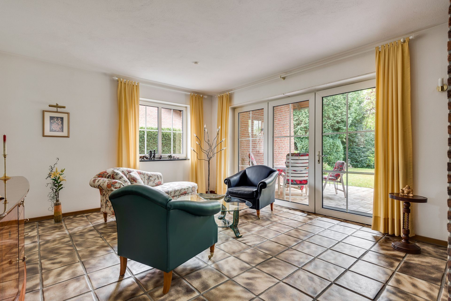2 Wohnzimmer (9,93 x 4,24/2,33 m + 3,47 x 3,03 m) mit gemütlicher Sitzecke, Kamin und Gartentür zur überdachten Terrasse (8,94 x 3,45 m).