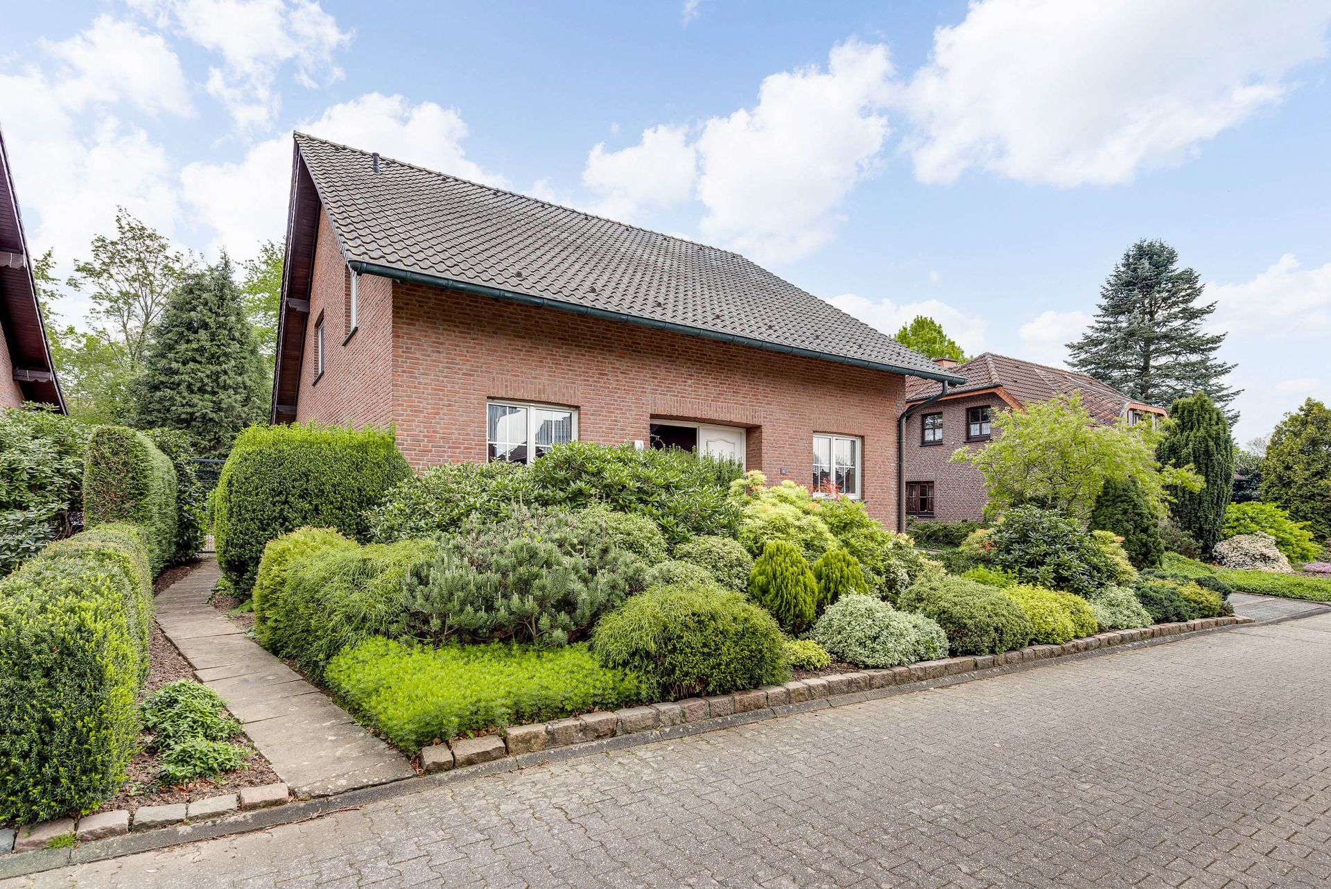Vorgarten mit Beeten und Sträuchern.