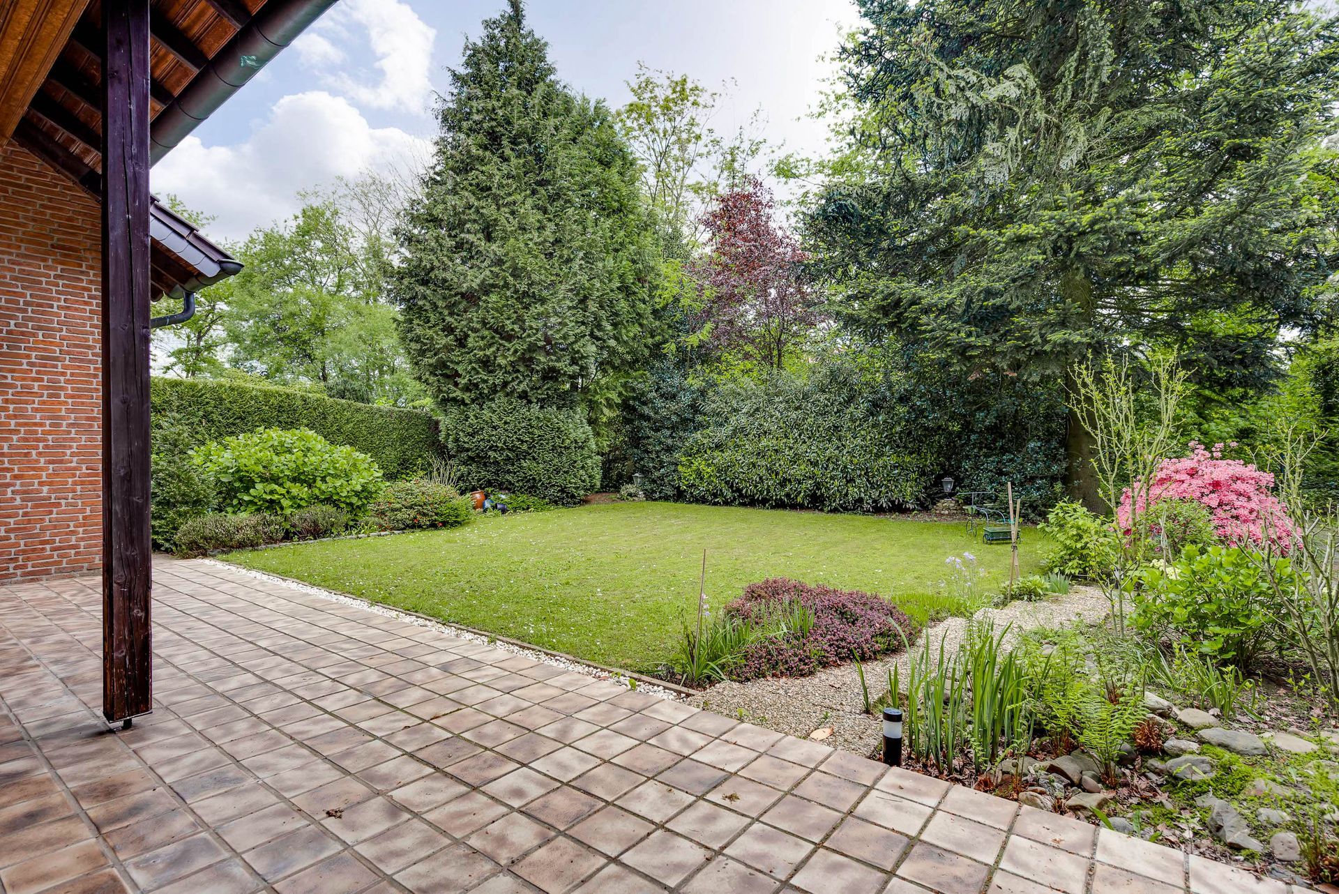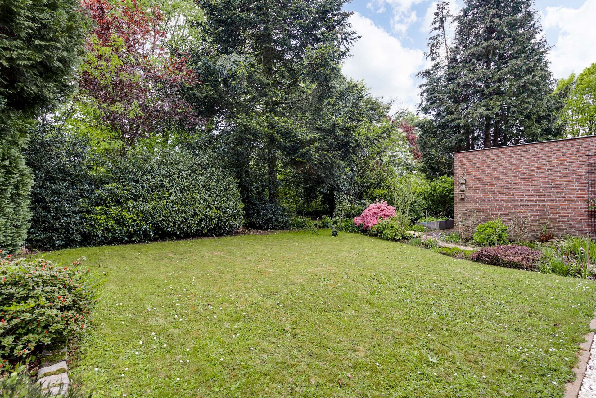 Üppig bewachsener Garten mit Rasen, Bäumen, Sträuchern und Beeten. Der Garten bietet viel Privatsphäre.