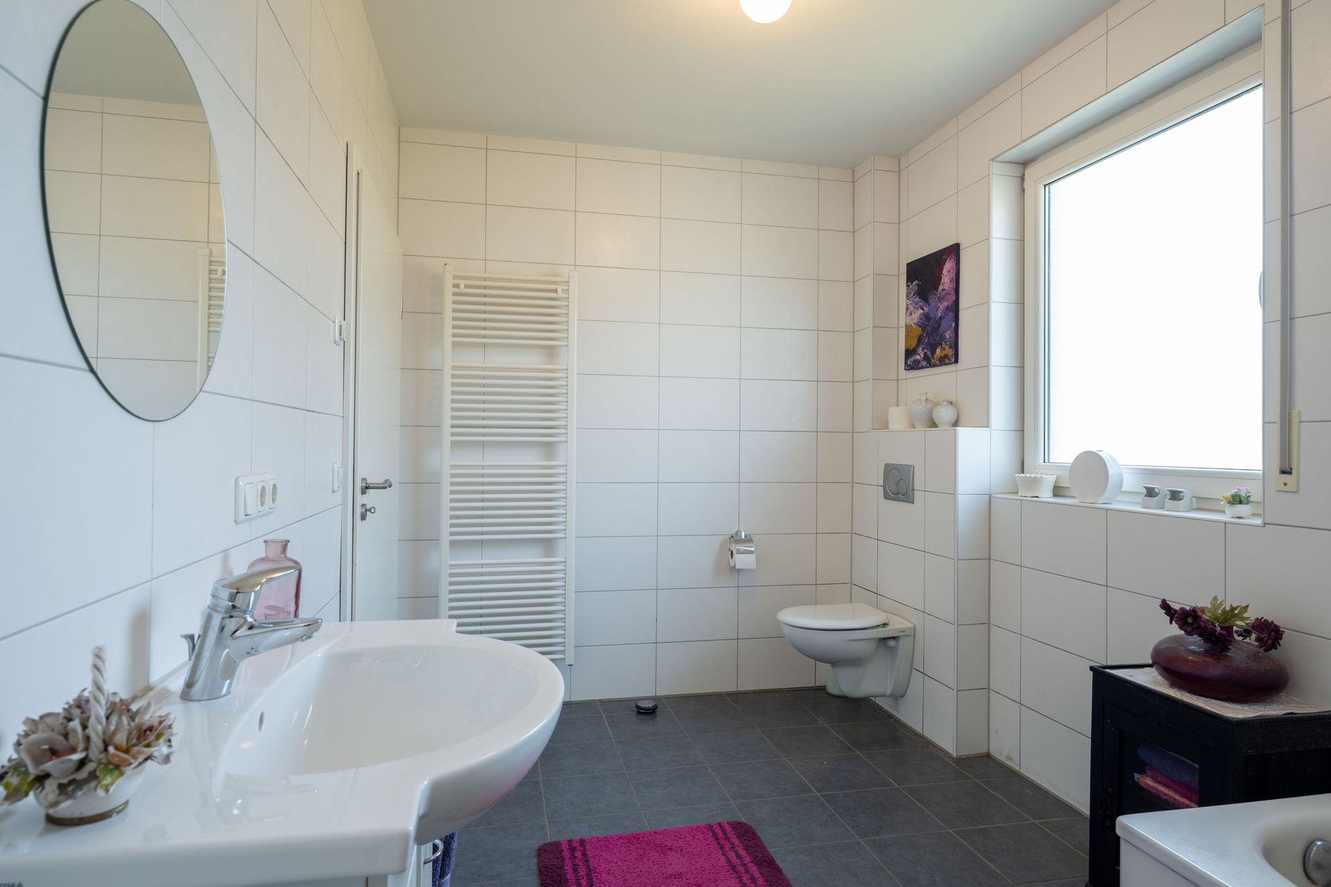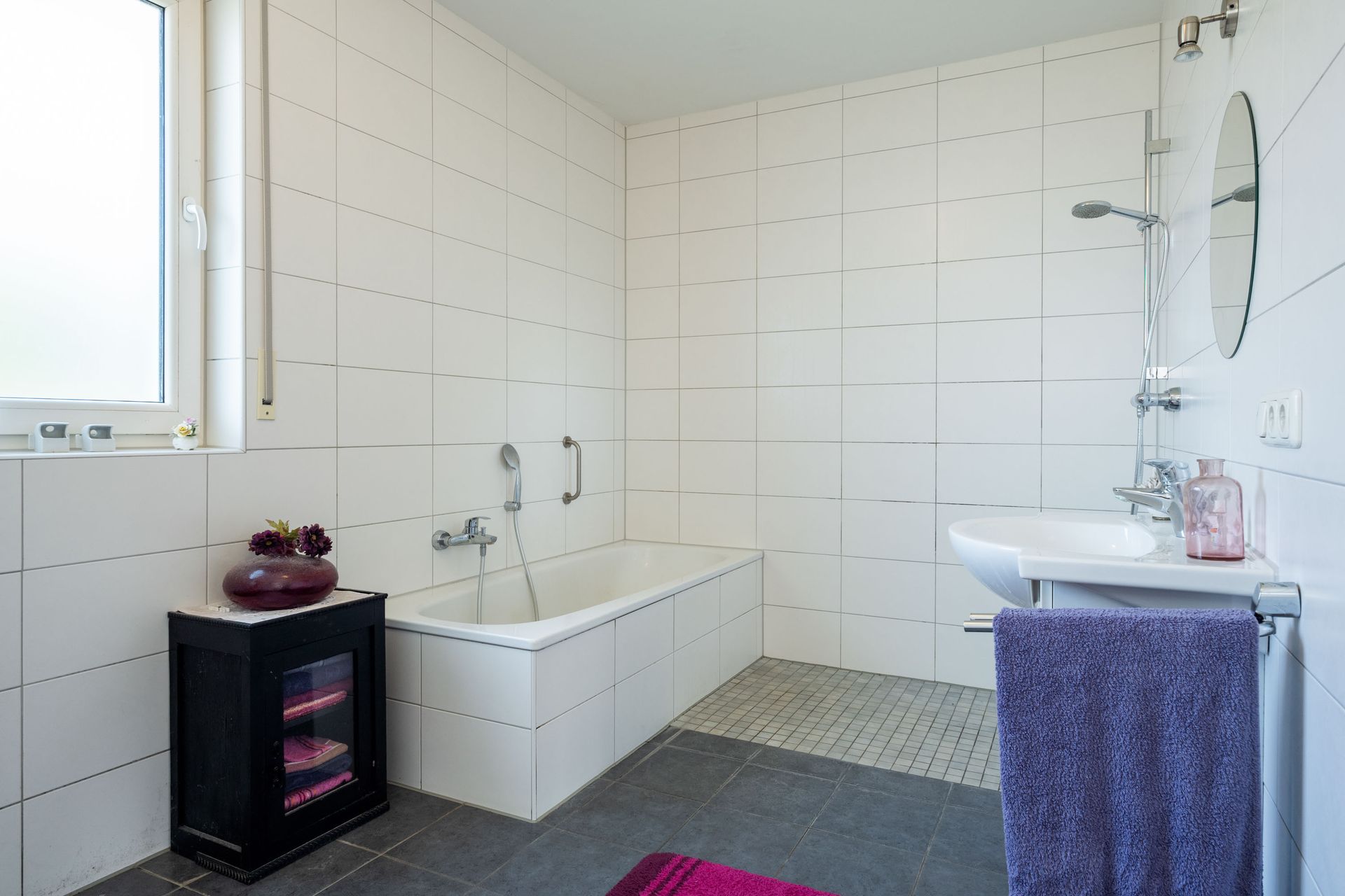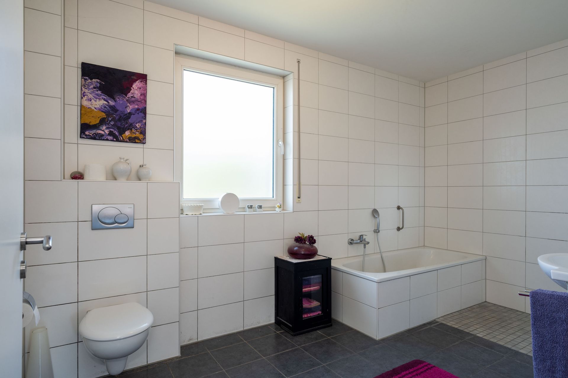 Badezimmer (3,98 x 2,31 m) mit Badewanne, begehbarer Dusche, Waschtisch und zweitem WC.