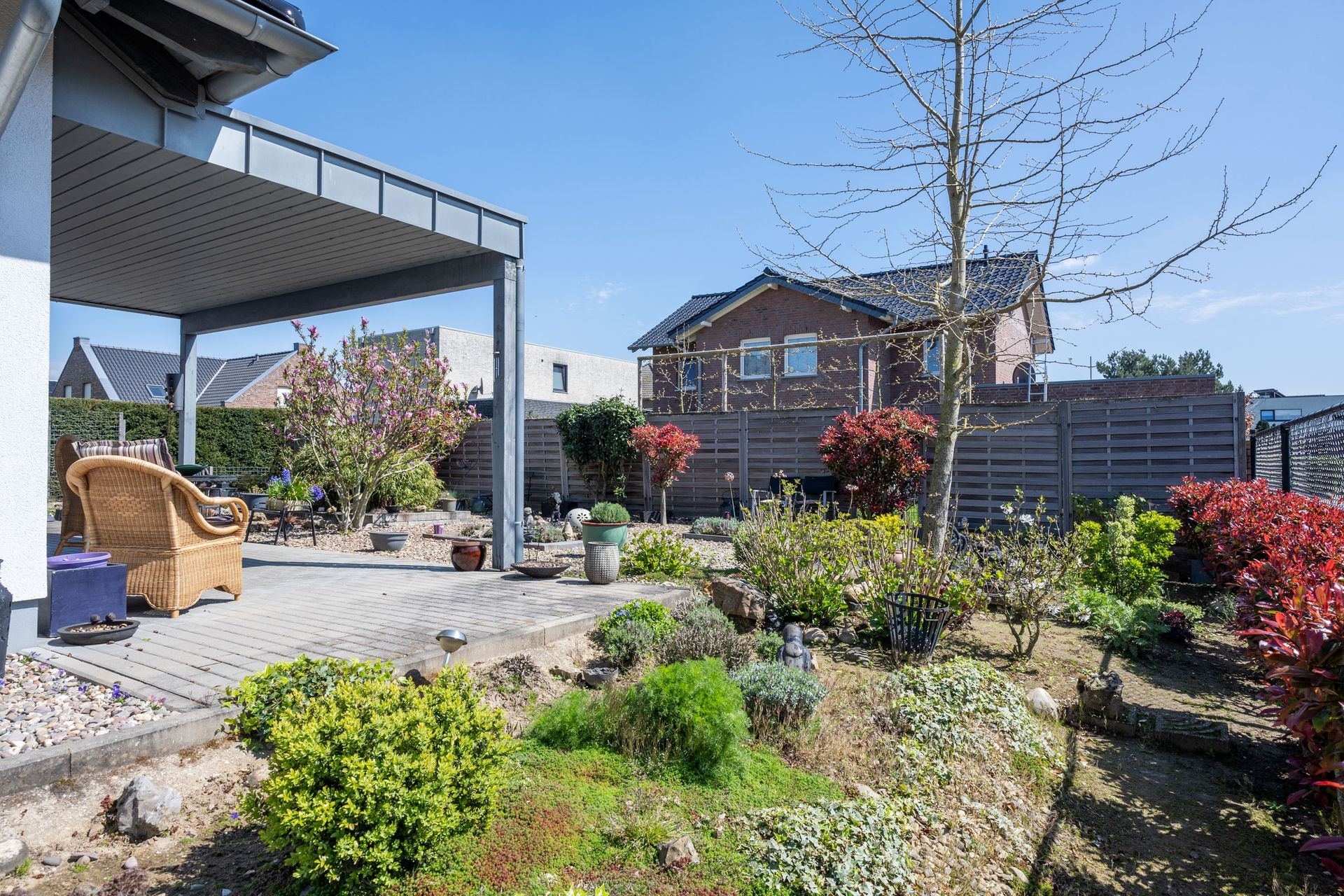 Rund um den Garten angelegte Beete, Kiesbeete, Sträucher, Niederstamm-Bäumchen, Hecken und ein Zaun. Mehrere Terrassen.