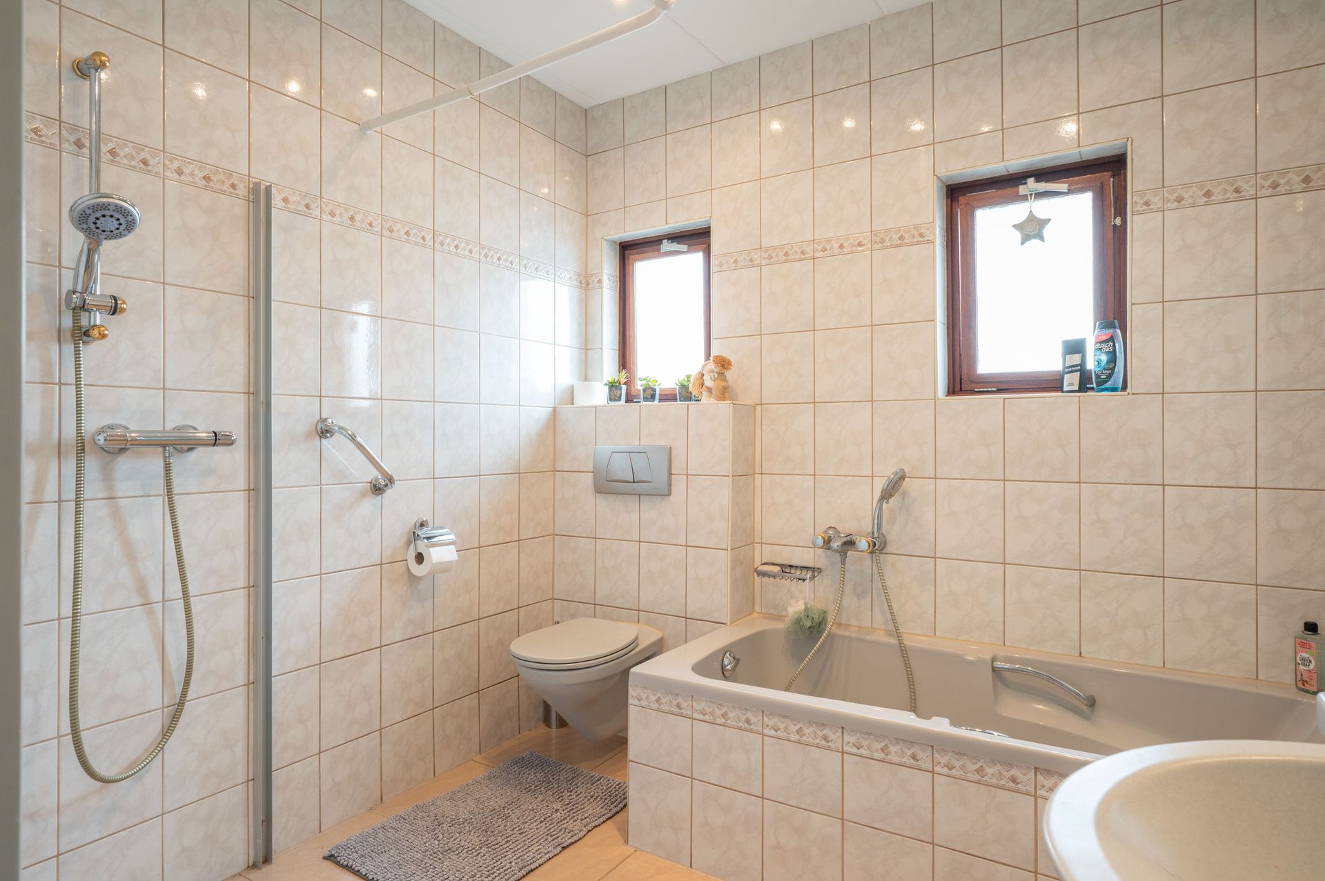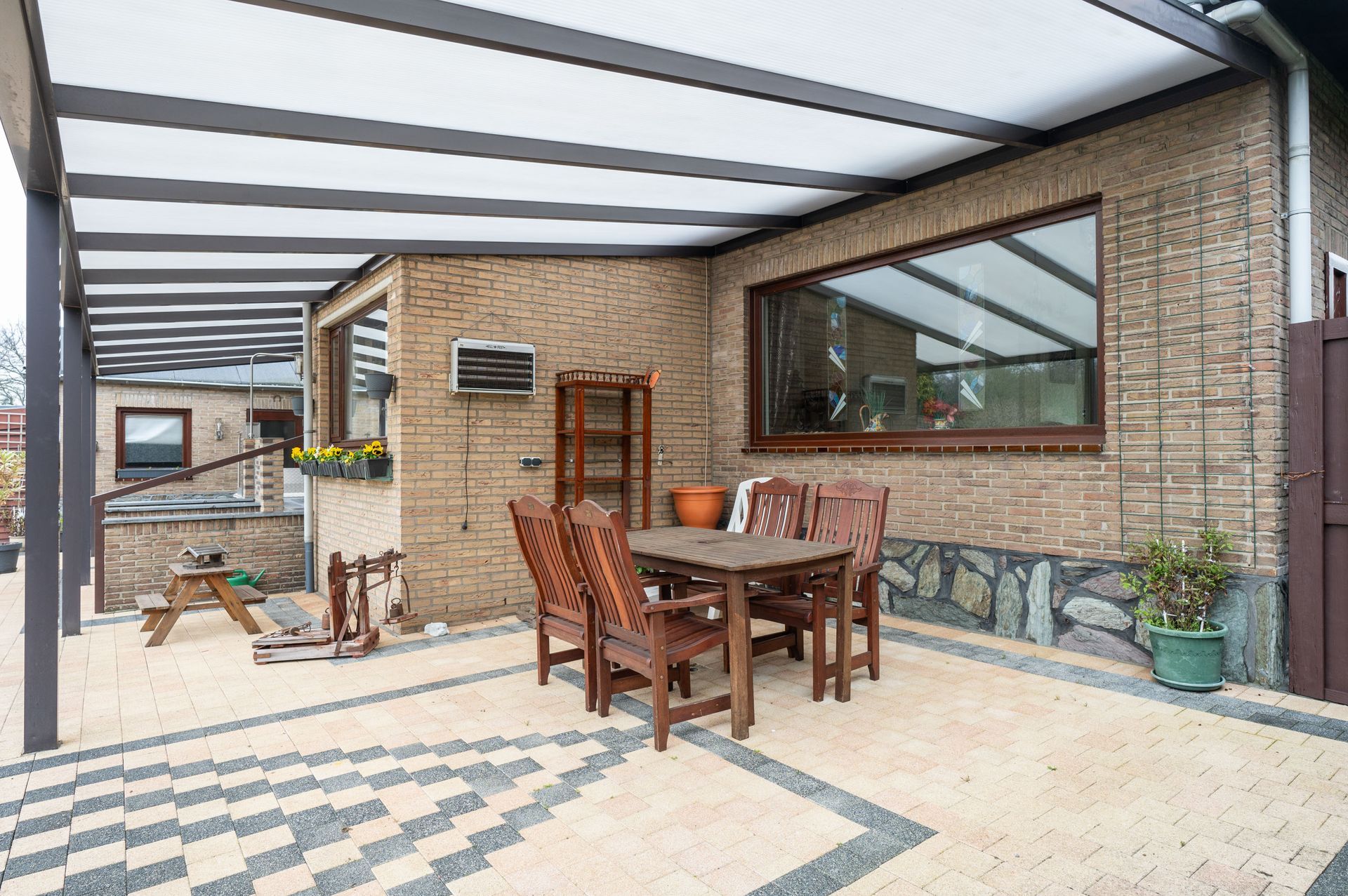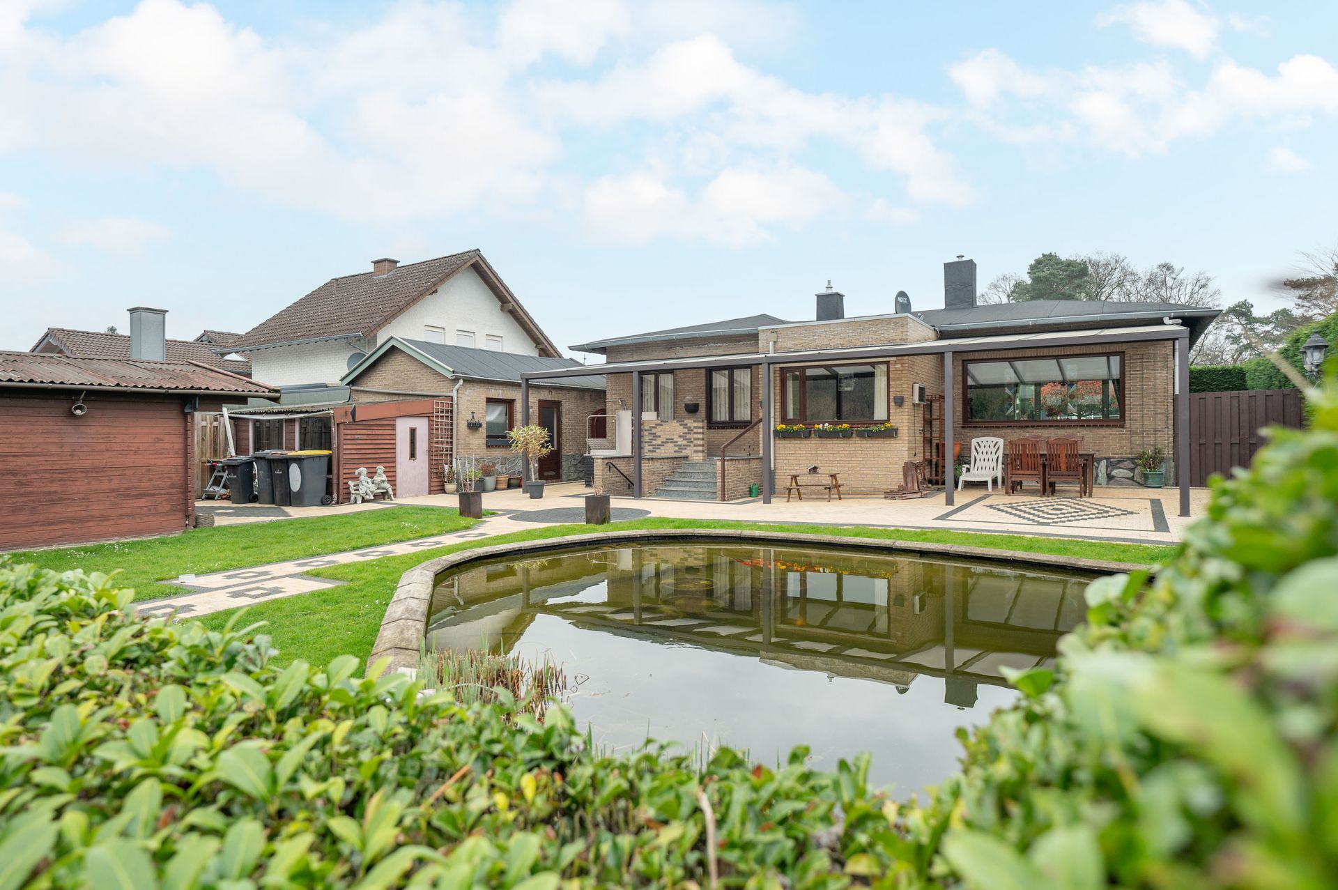 Der tiefe Garten ist schön angelegt mit verschiedenen Terrassen, einer Aluminium-Terrassenüberdachung über die gesamte Breite des Hauses, einem Teich, einem Gartenhaus und vor allem viel Rasenfläche.