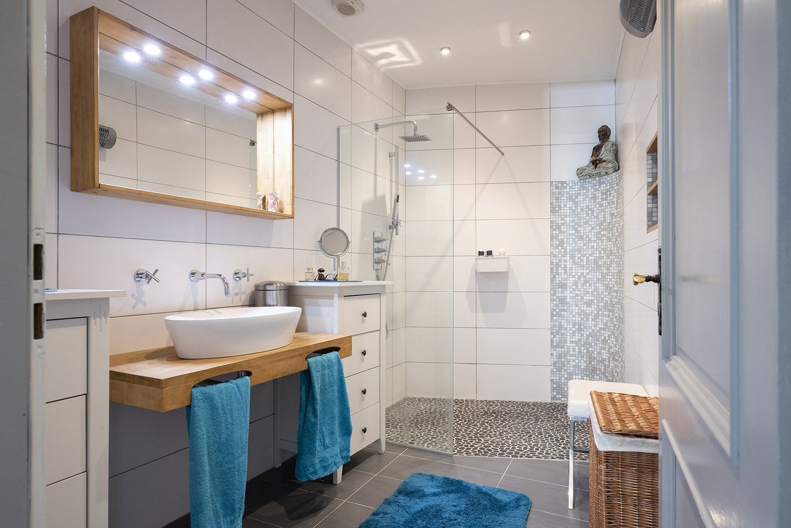 Gepflegtes modernes Badezimmer (3.23 x 1.68 m) mit großer ebenerdiger Dusche und Waschbecken.