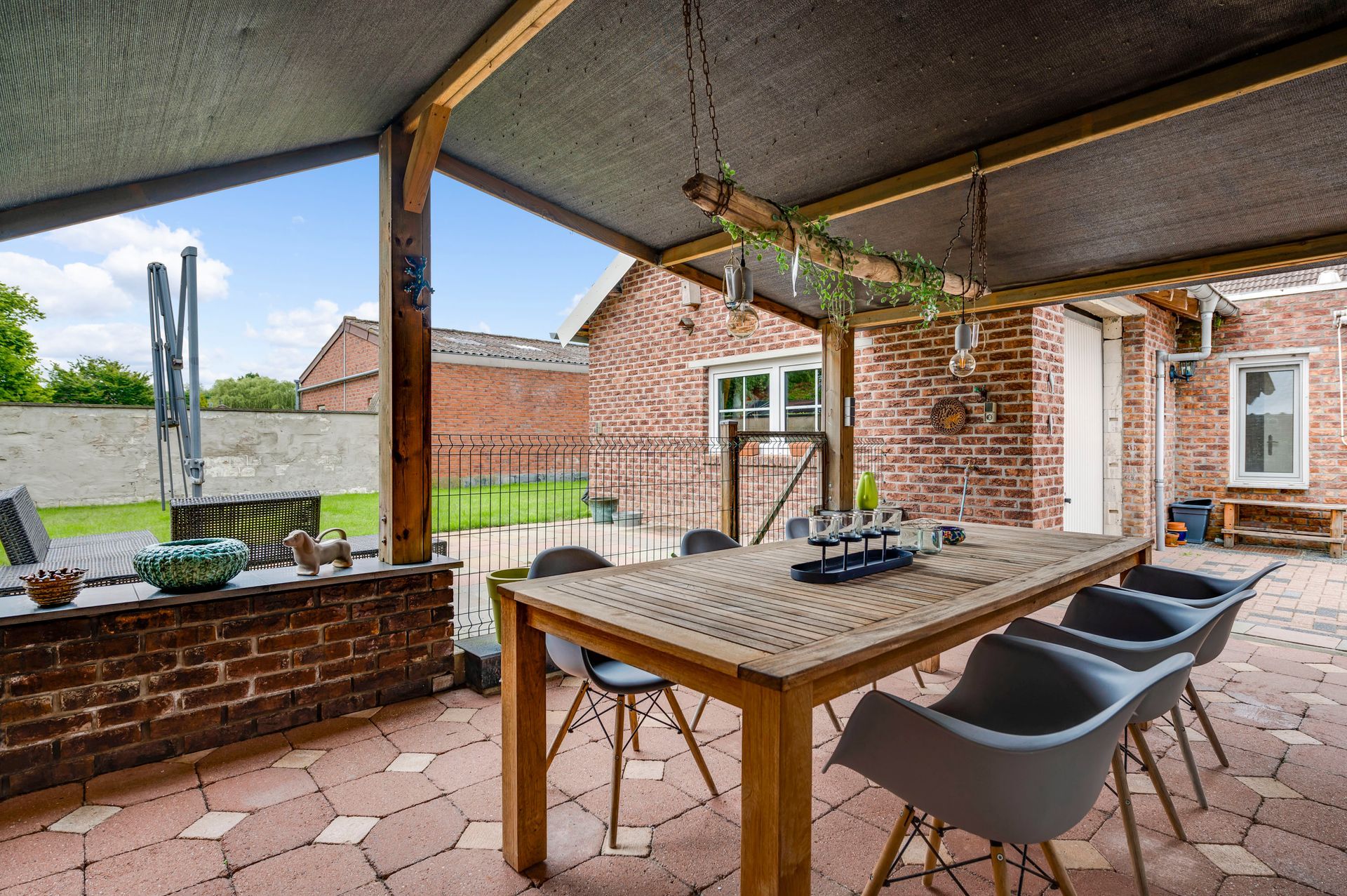 Und draußen erwartet Sie der pflegeleichte Garten mit der gemütlichen, überdachten Lounge, die zum Genießen der Sommerabende einlädt….