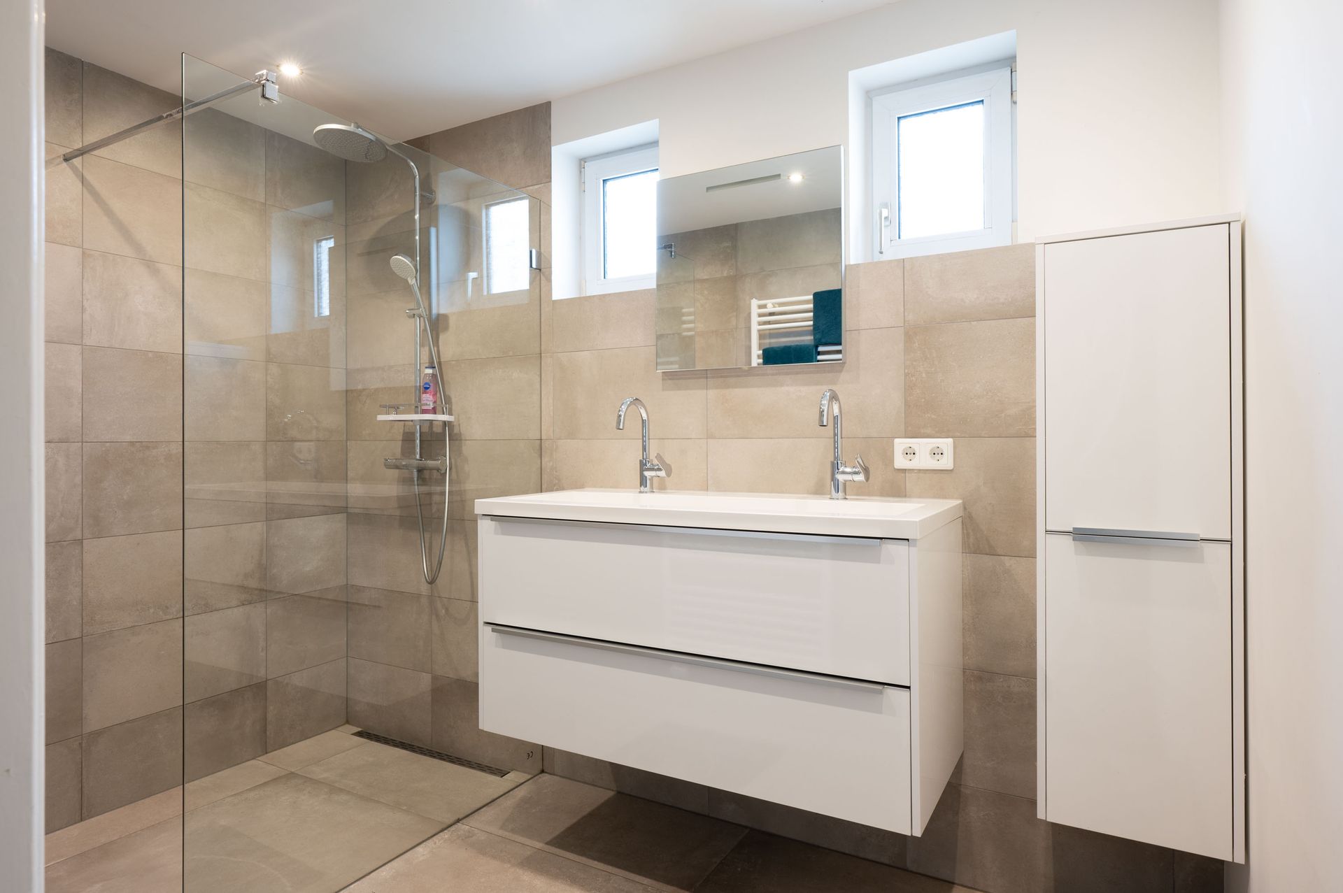 Modernes Badezimmer mit begehbarer Dusche (2,99 x 1,83 m) und Doppelwaschtisch.