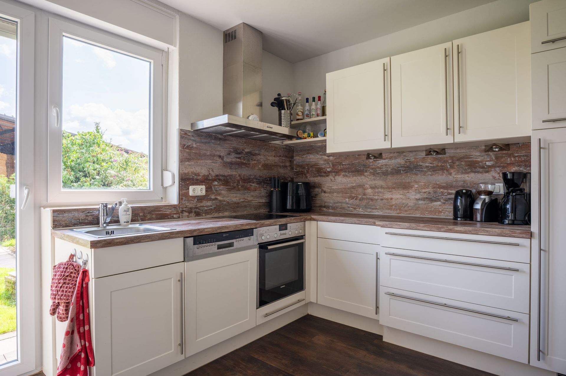 Geschlossene Küche mit ordentlicher Einbauküche (2018) inklusive Geschirrspüler, Kühlschrank, Backofen, Ceran-Kochfeld und Dunstabzugshaube.