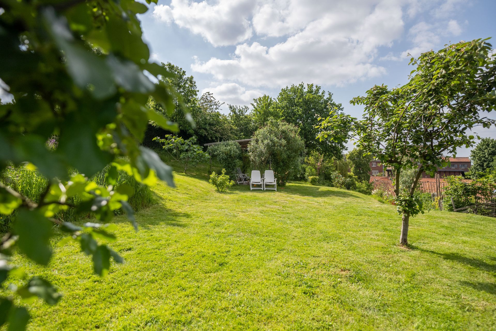 Idyllischer Garten, teilweise auf einem Hügel gelegen, mit Blick auf das Dorf und (kletter-)Pfade, Rasenfläche, (Obst-)Bäume, Sträucher, Gartenhaus und Hausweide.