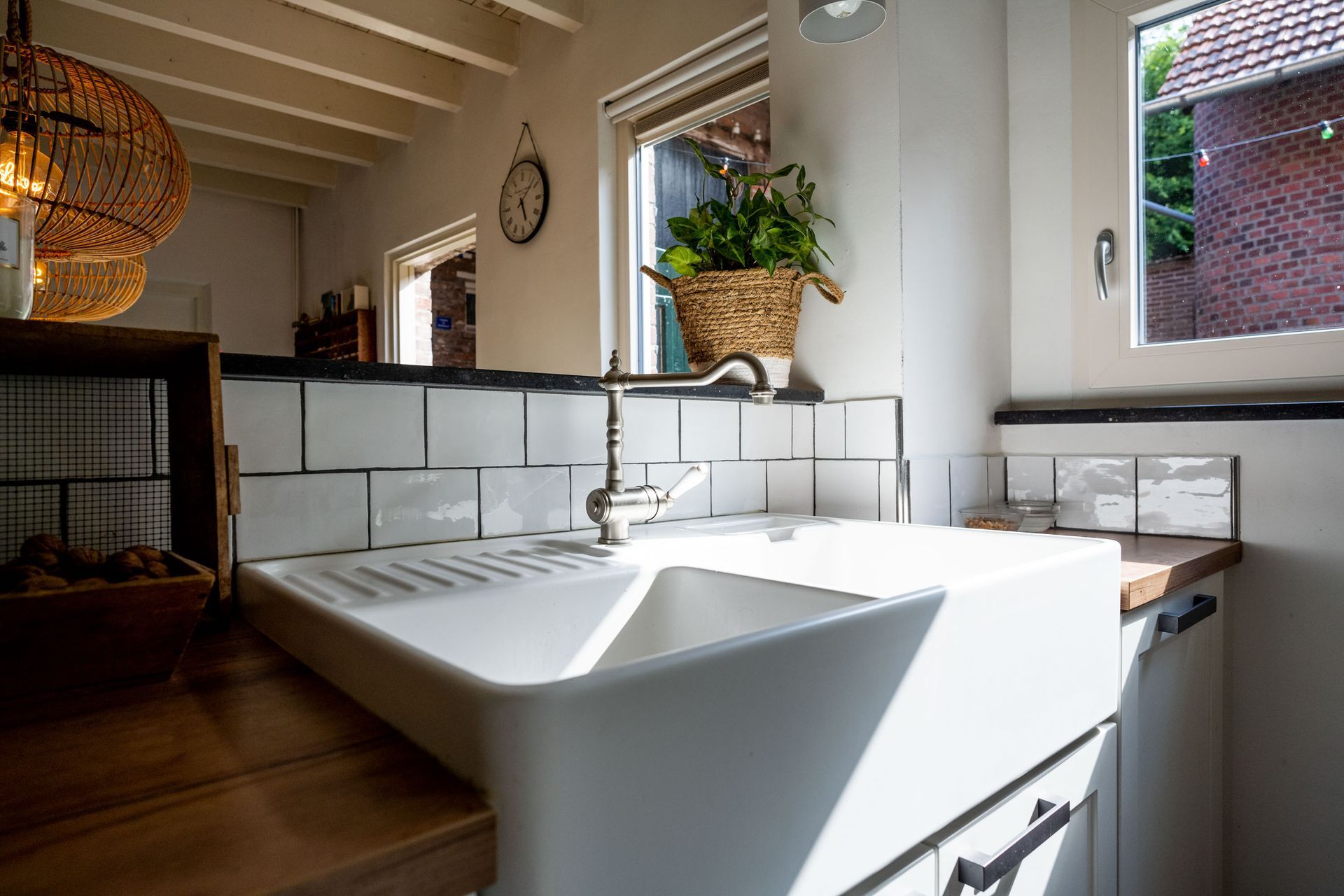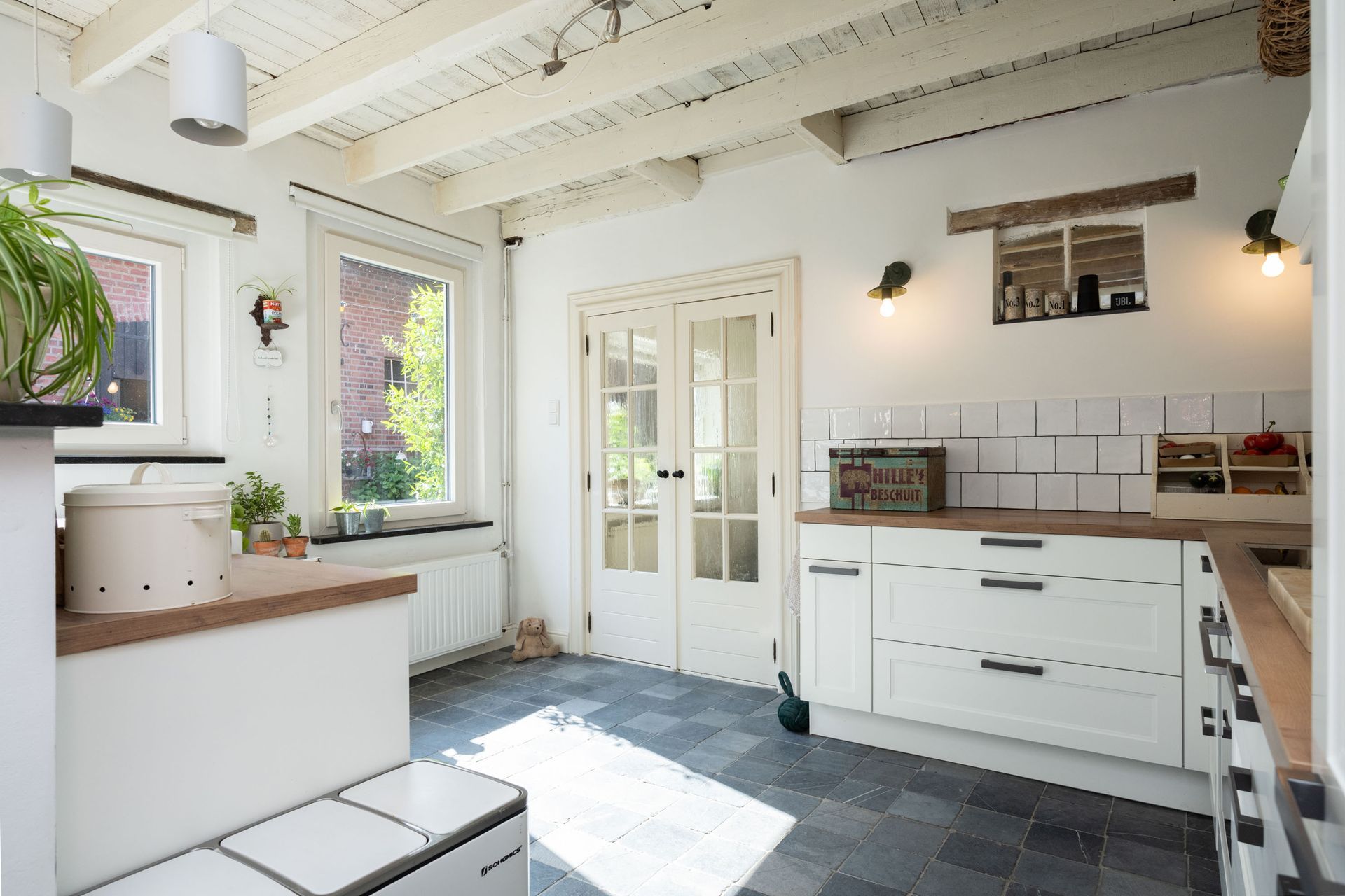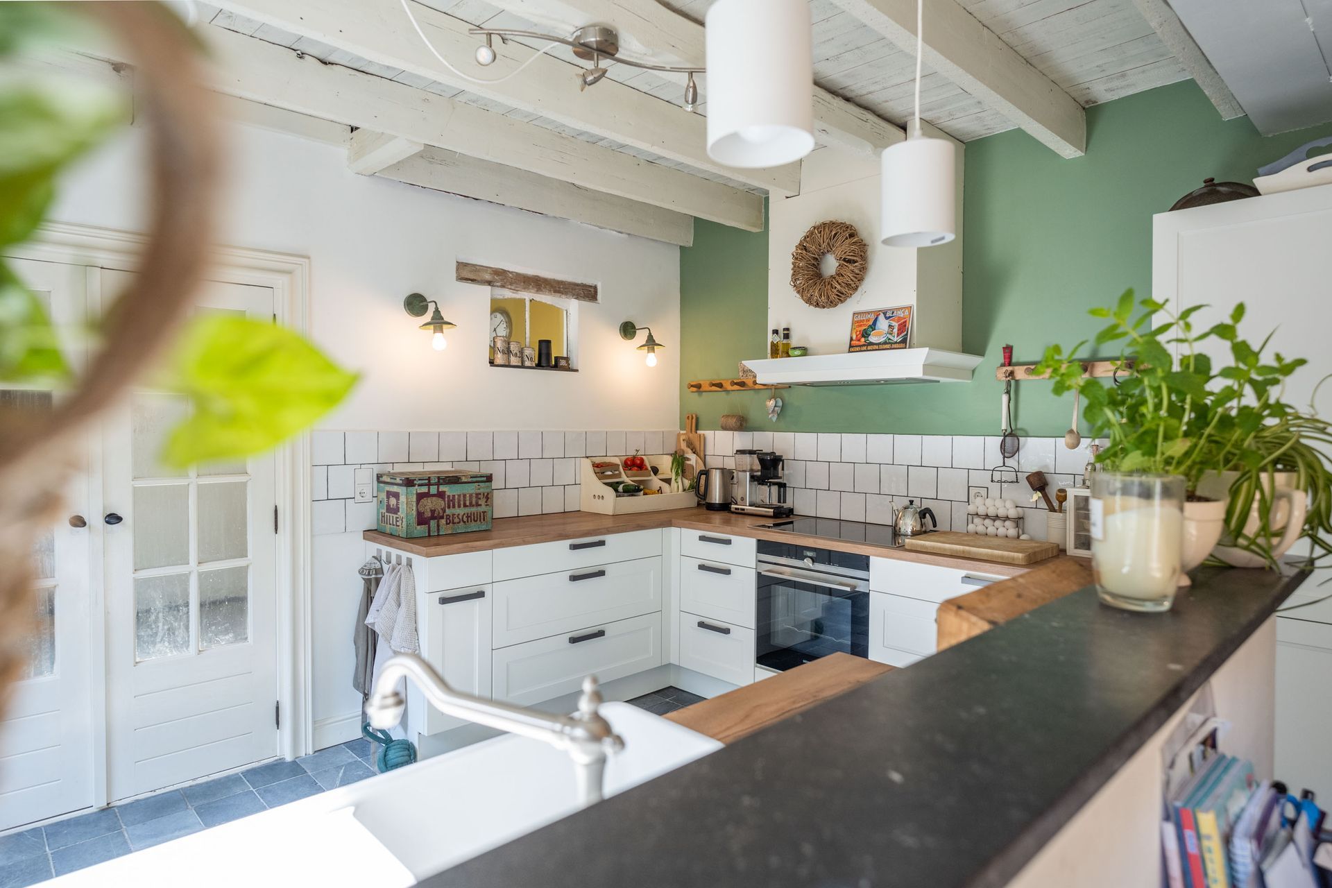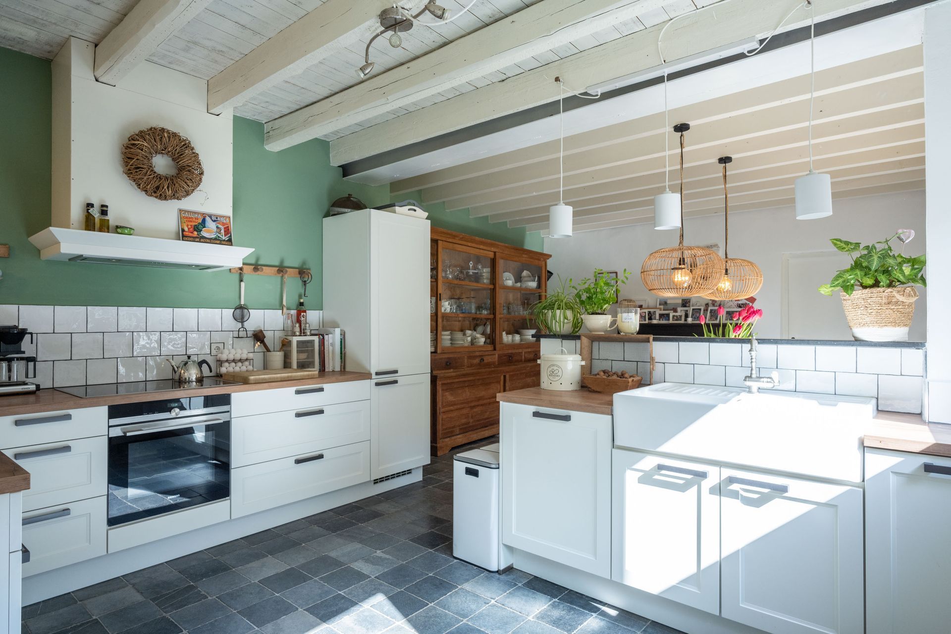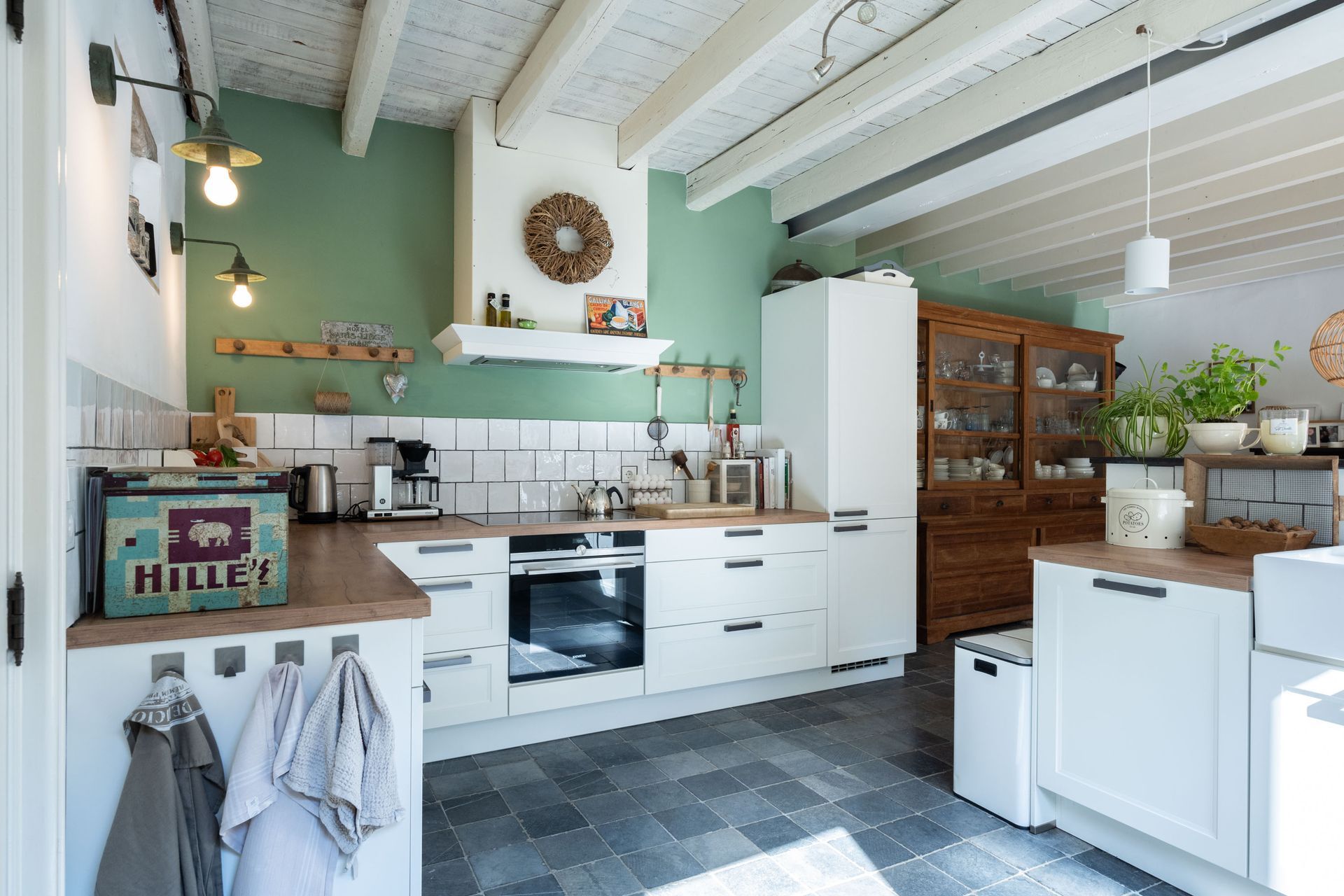 Wohnküche (7,16 x 4,40 m) mit ländlicher Einbauküche mit Induktionskochfeld, Geschirrspüler, Backofen, Kühlschrank mit Gefrierfach, doppeltem Porzellanspülbecken und Dunstabzugshaube. Der Boden ist mit Natursteinfliesen ausgelegt.
