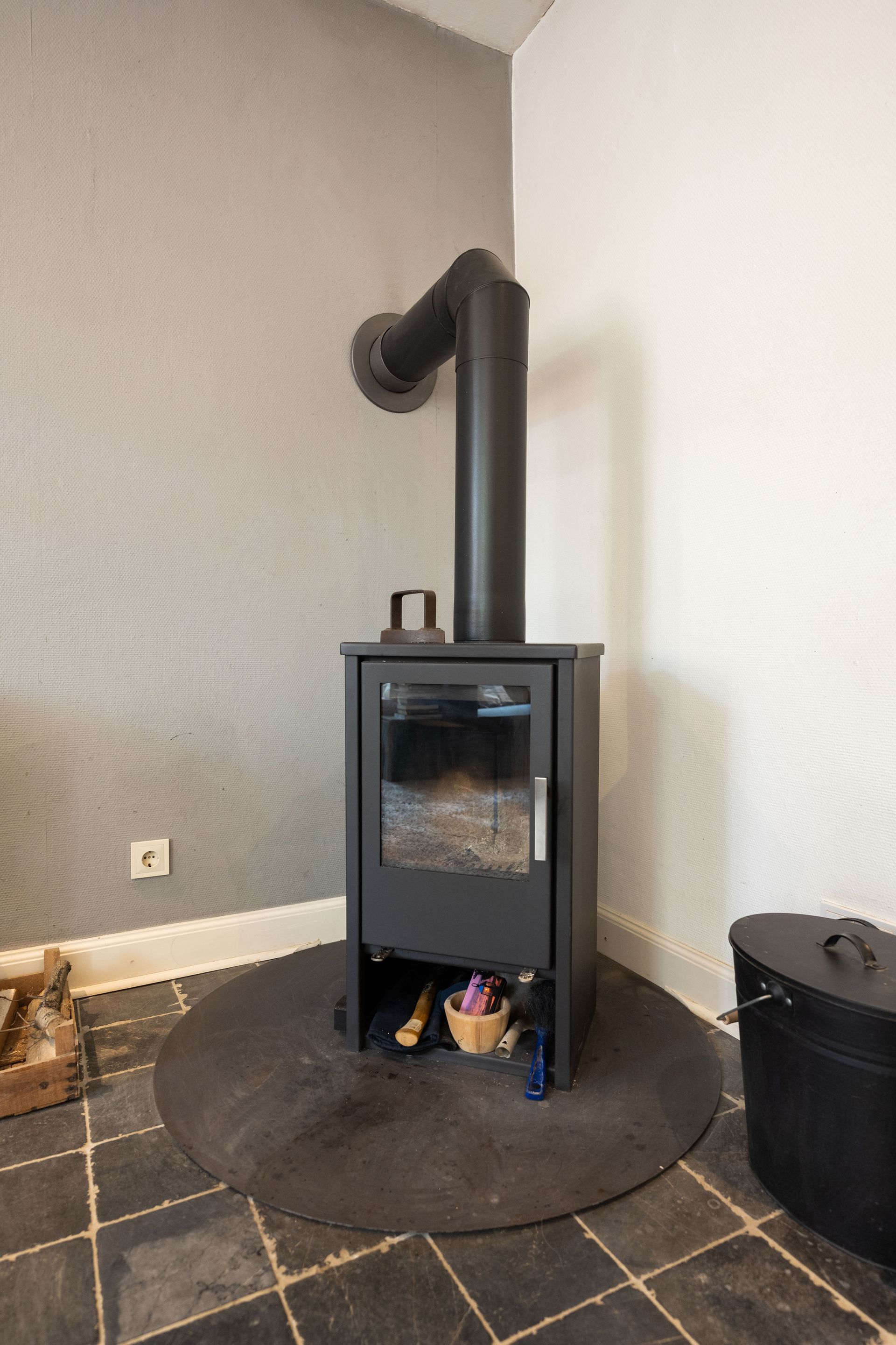 Wohnzimmer (4,64 x 4,07 m) mit Natursteinfliesenboden und Holzofen.