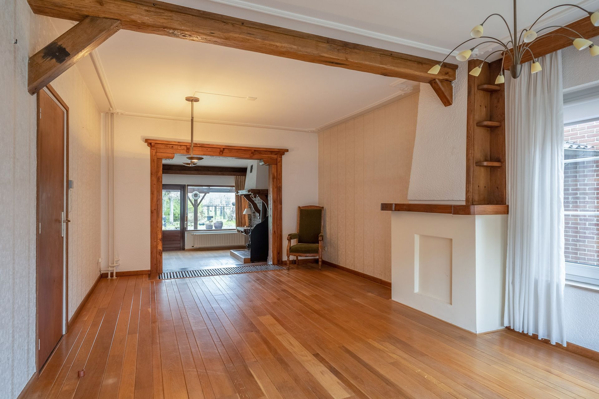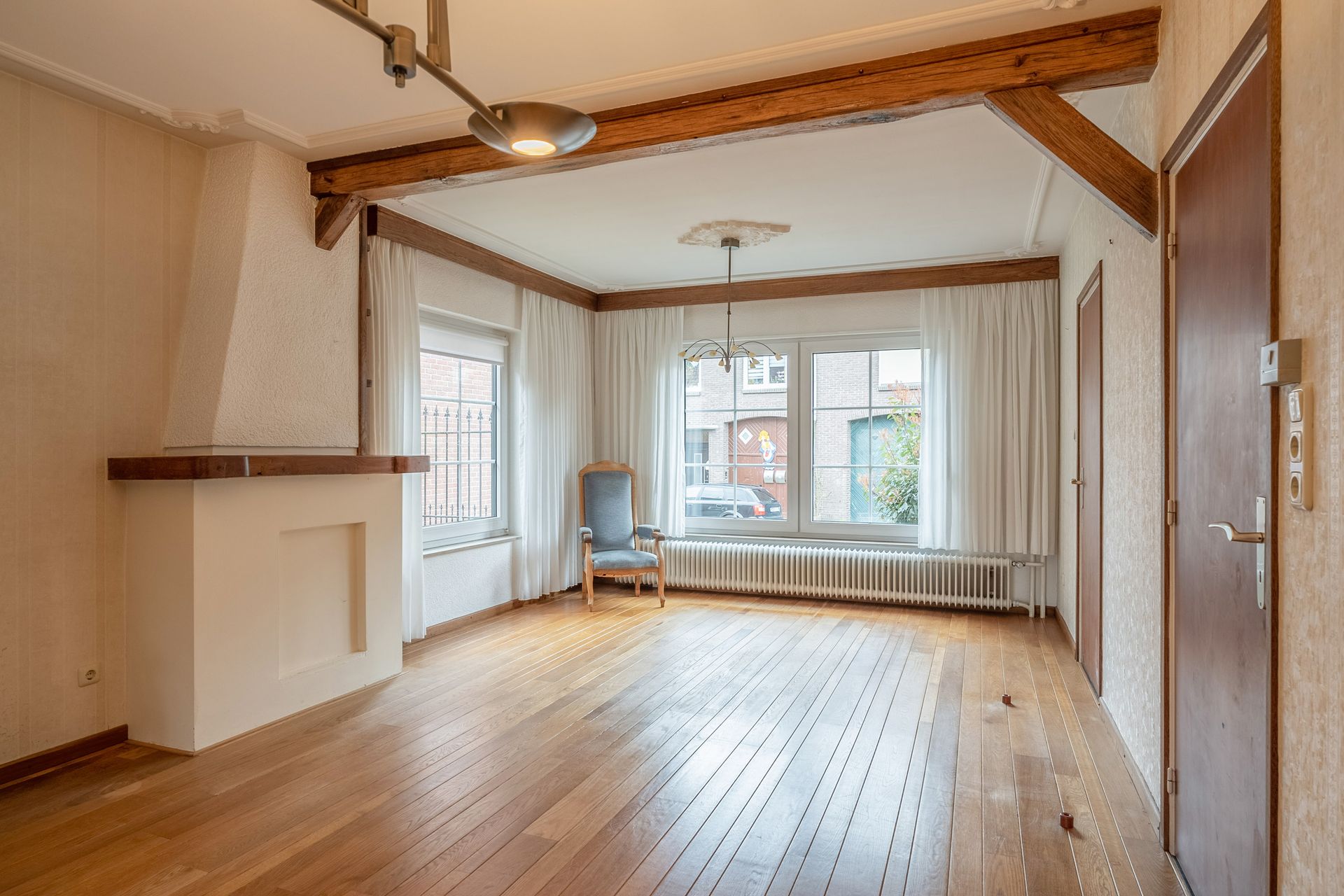 Woonkamer (6.93 x 3.83 m) met parketvloer en schouwpartij.