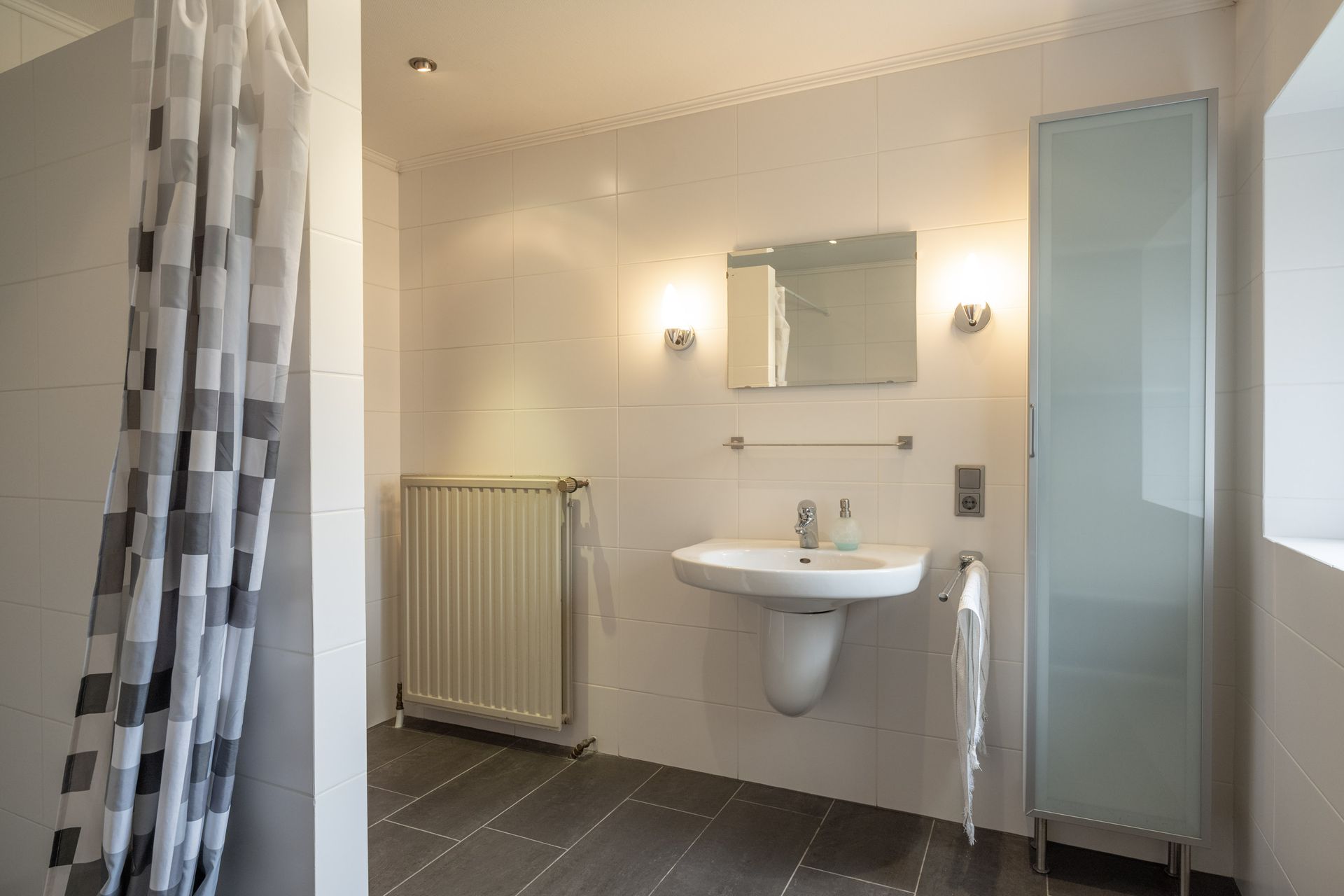 Volledig betegelde, gemoderniseerde badkamer met inloopdouche en wastafel.