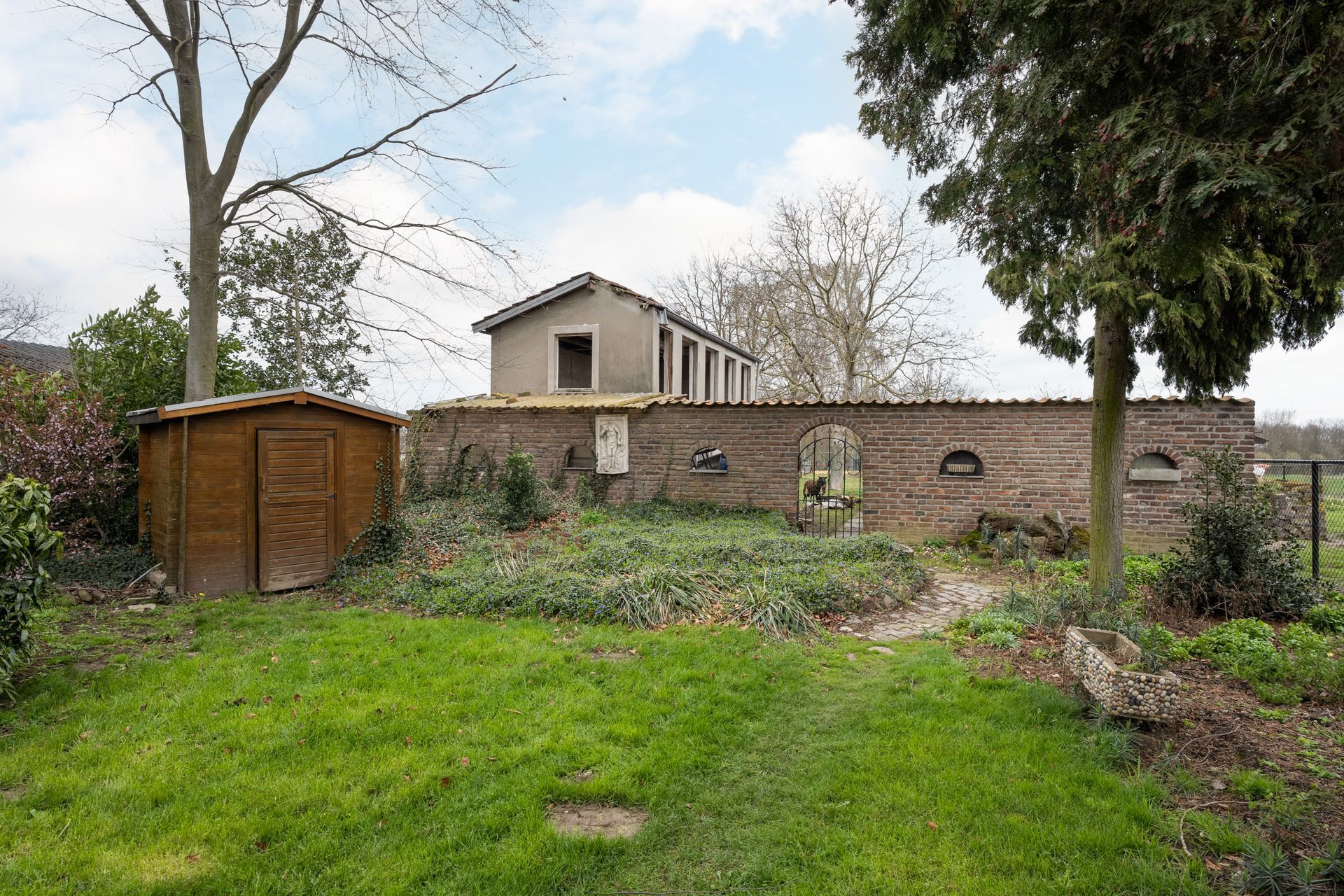 Gemetselde muur met poortje.