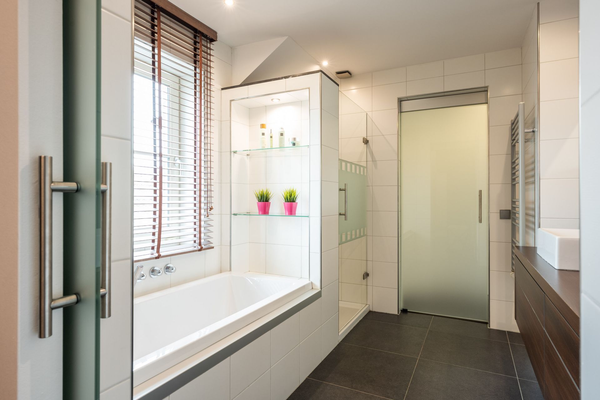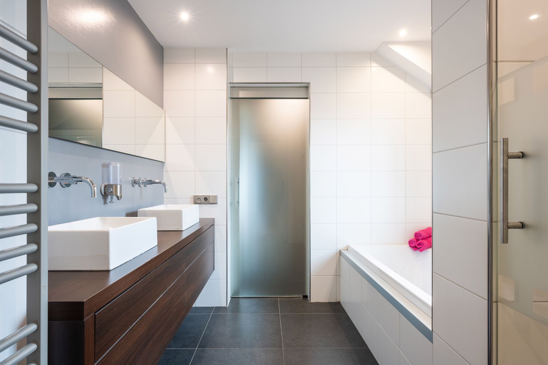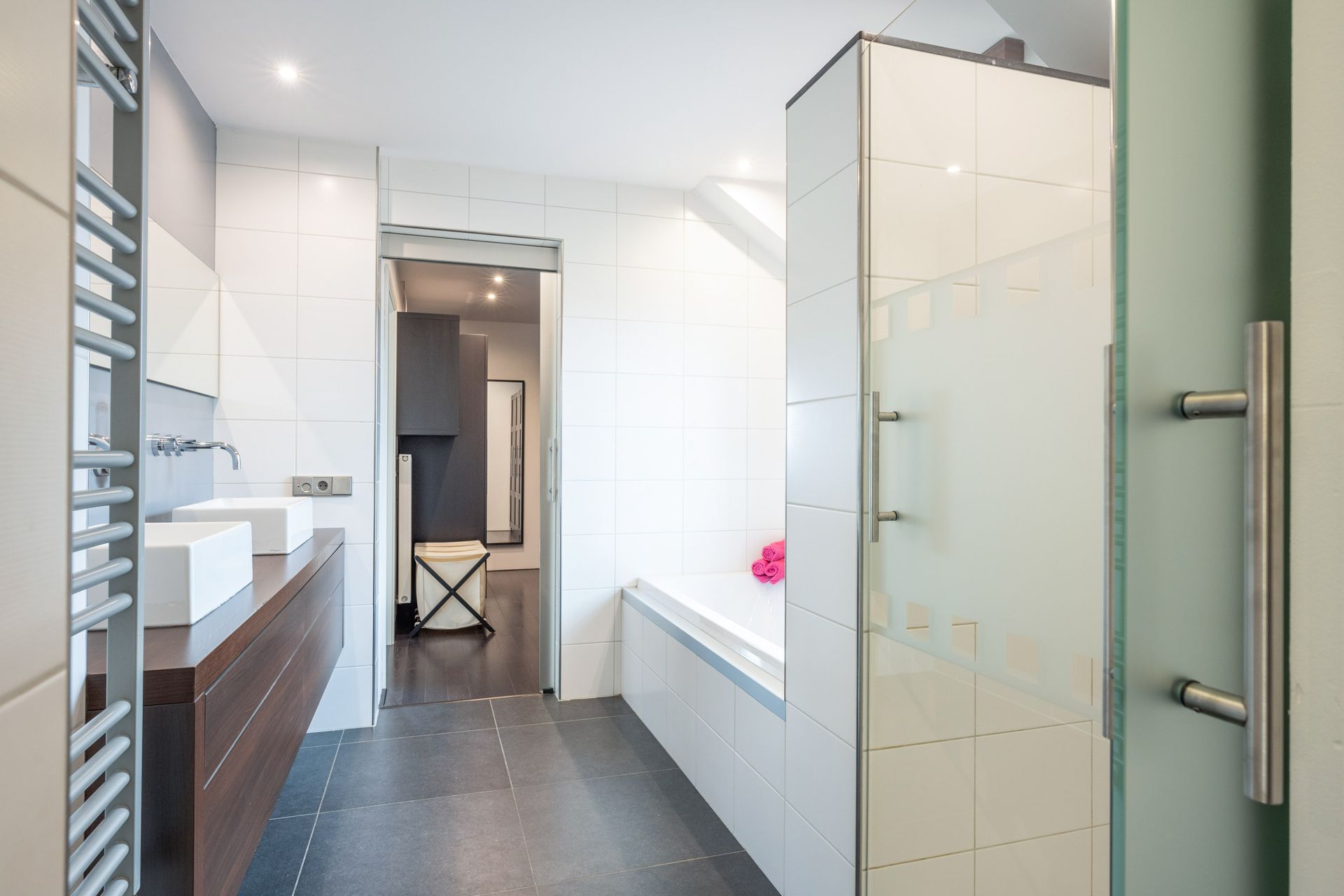 Luxuriöses Badezimmer (2,93 x 2,56 m) mit Badewanne, Dusche, Badmöbel mit Doppelwaschbecken und Glasschiebetüren.