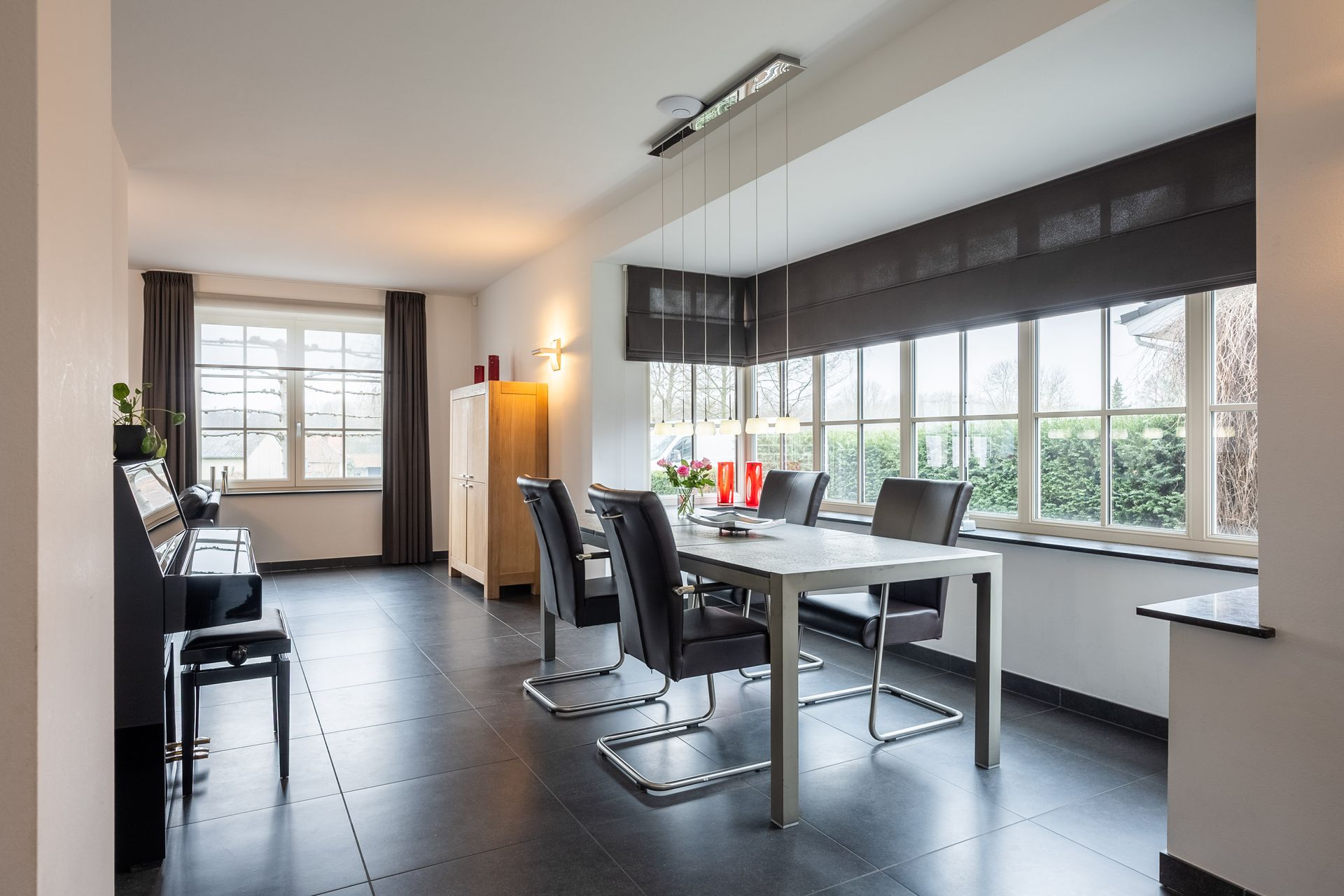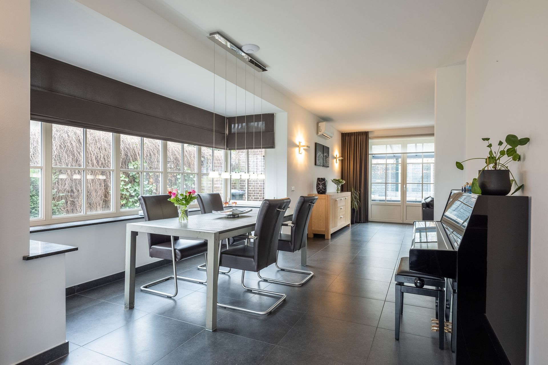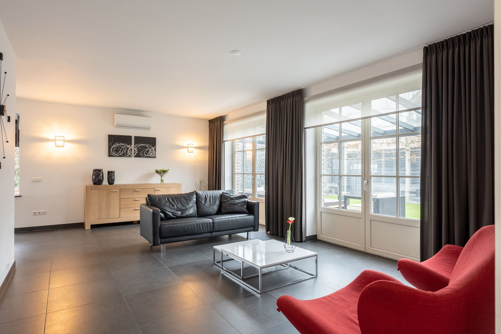 Geräumiges Wohnzimmer (11,17 x 6,90/6,16 m) mit Erker, zwei doppelten Terassentüren zum Garten, zeitlosem anthrazitfarbenem Fliesenboden und Klimaanlage.