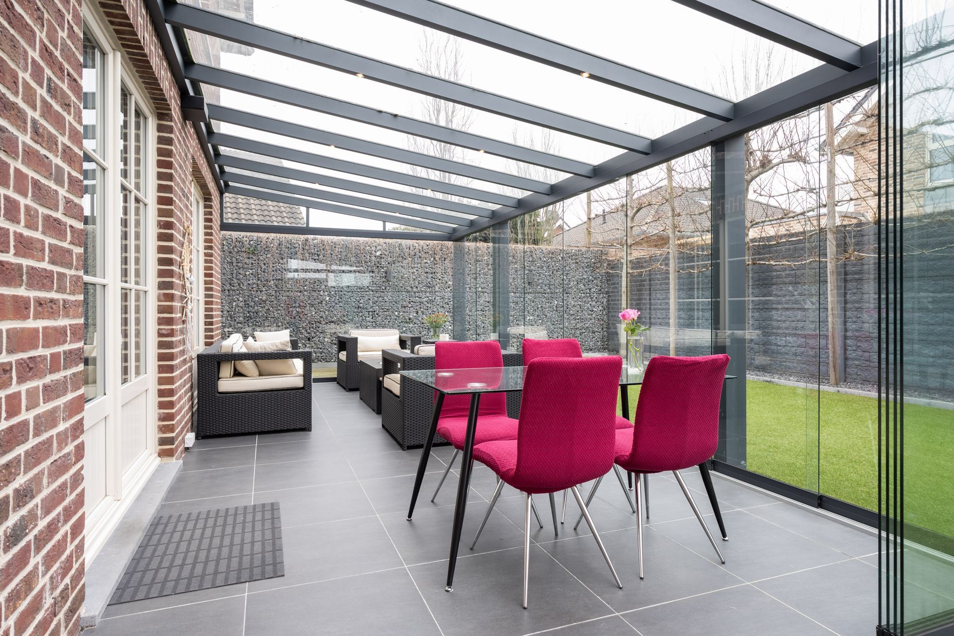 Großer Wintergarten (6,72 x 3,23 m) in Aluminiumbauweise mit Glasschiebewänden und Fliesenboden.